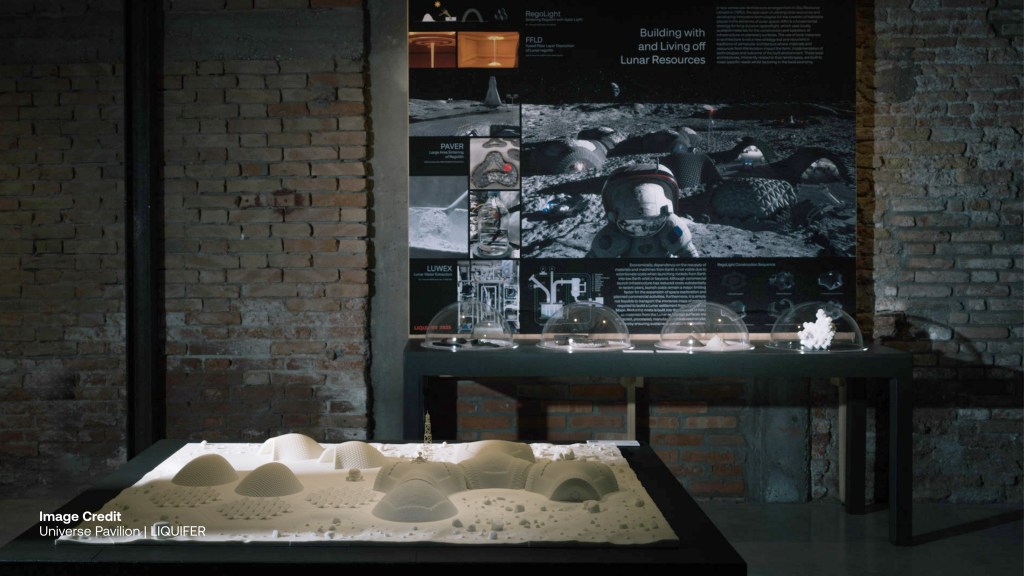 The open structure is composed of unconventional materials including foam glass and lunar-inspired basalt. Built at MIT Media Lab for MIT’s 2025 lunar landing mission, a scale replica is on show at the Universe Pavilion courtesy of art, space and science initiative Inploration co-founded by Richelle Ellis and Lawrence Azerrad.