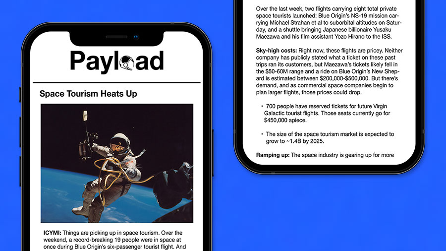 The demand for space industry news has given rise to digital media company Payload Space. Payload publish a daily newsletter covering the business and policy of space.