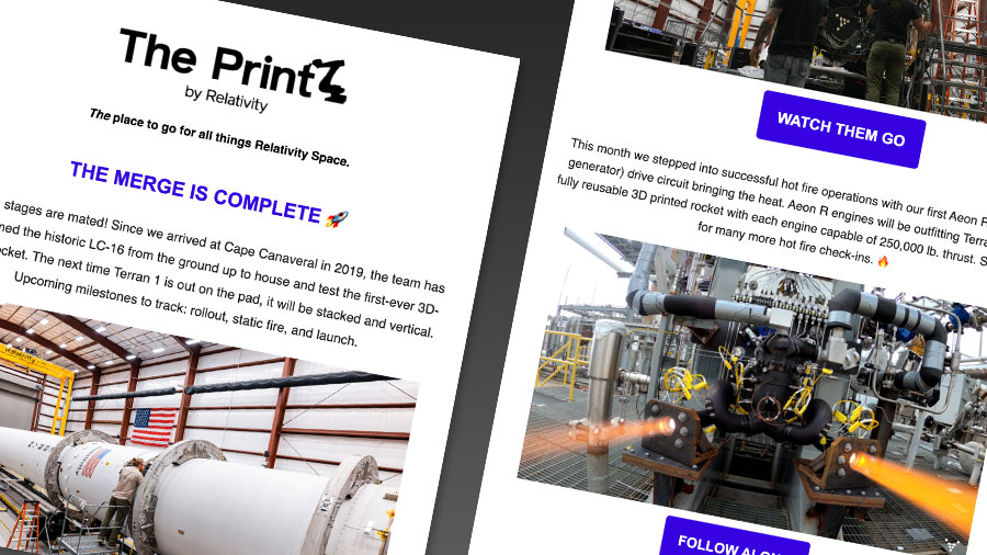 Relativity Space established a regular newsletter named ‘The Print’ detailing their progress towards their first launch while highlighting key staff, technology and promoting merchandise.