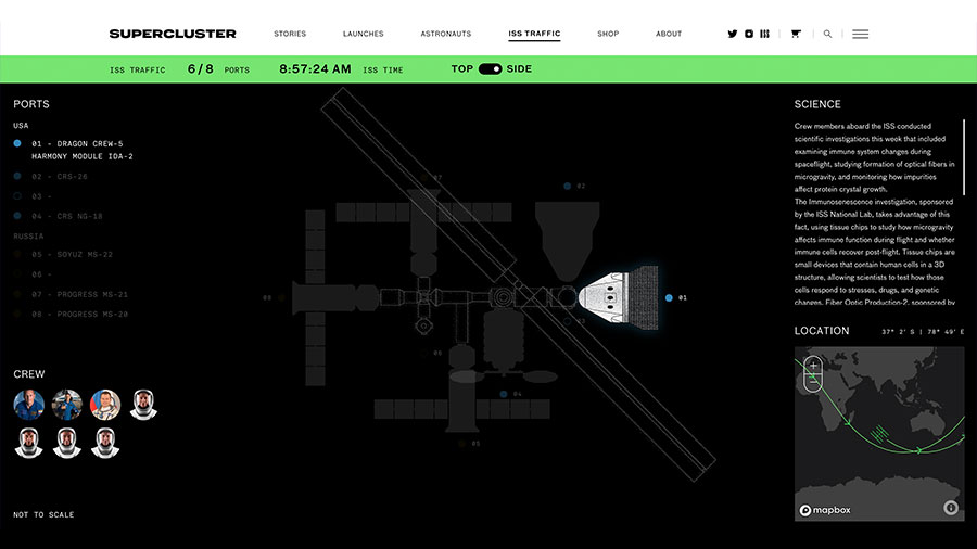 Supercluster offers a launch tracking app as well as a log of all space-flown humans and real-time ISS configurations.